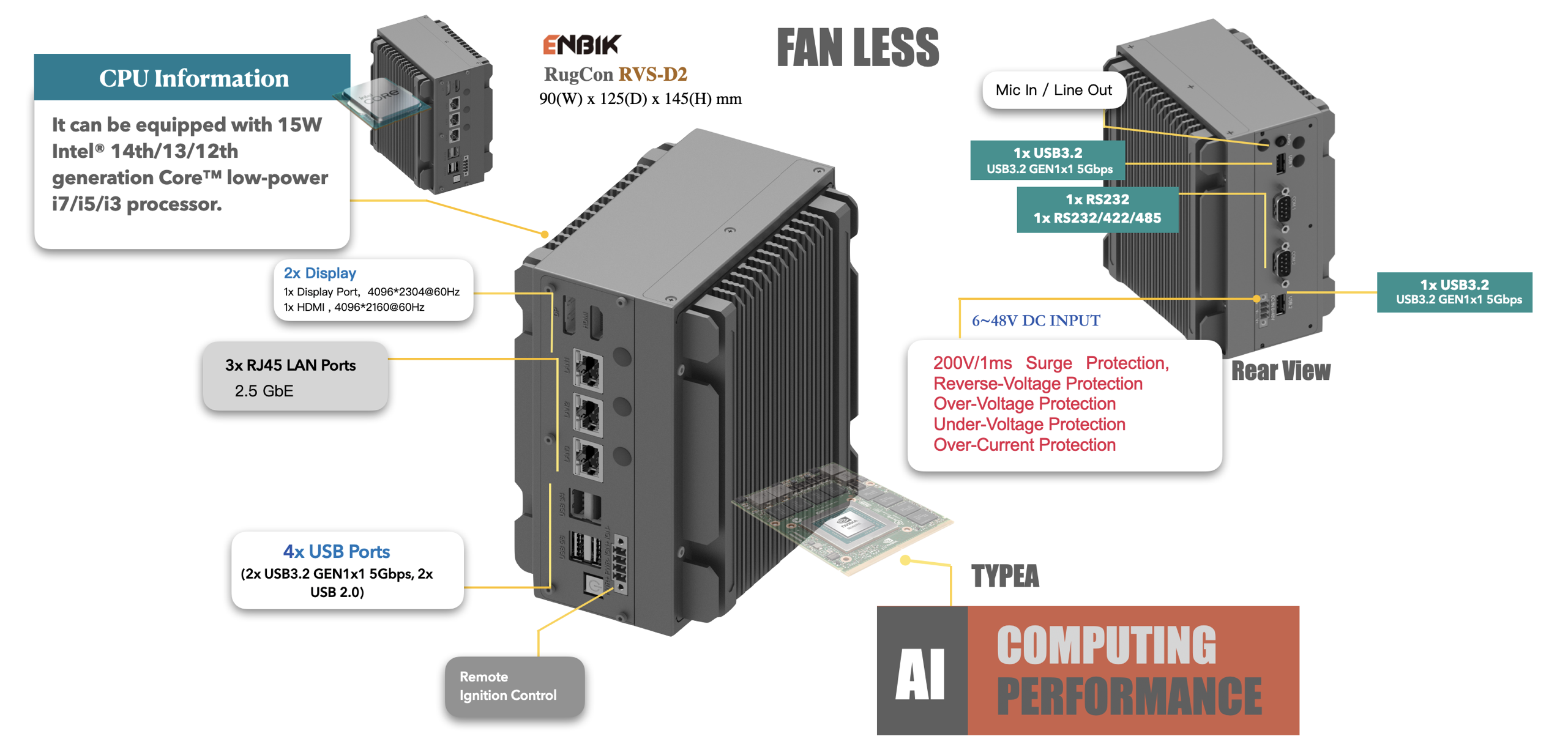 恩比克 RVS-D2,全球第一款无风扇超迷你手掌大小带32.5GbE网口的MXM GPU边缘AI人工智能计算平台,支持宽温工作和英特尔®13/12 高性能酷睿处理器, NVIDIA GPU AI算力达194 TOPS