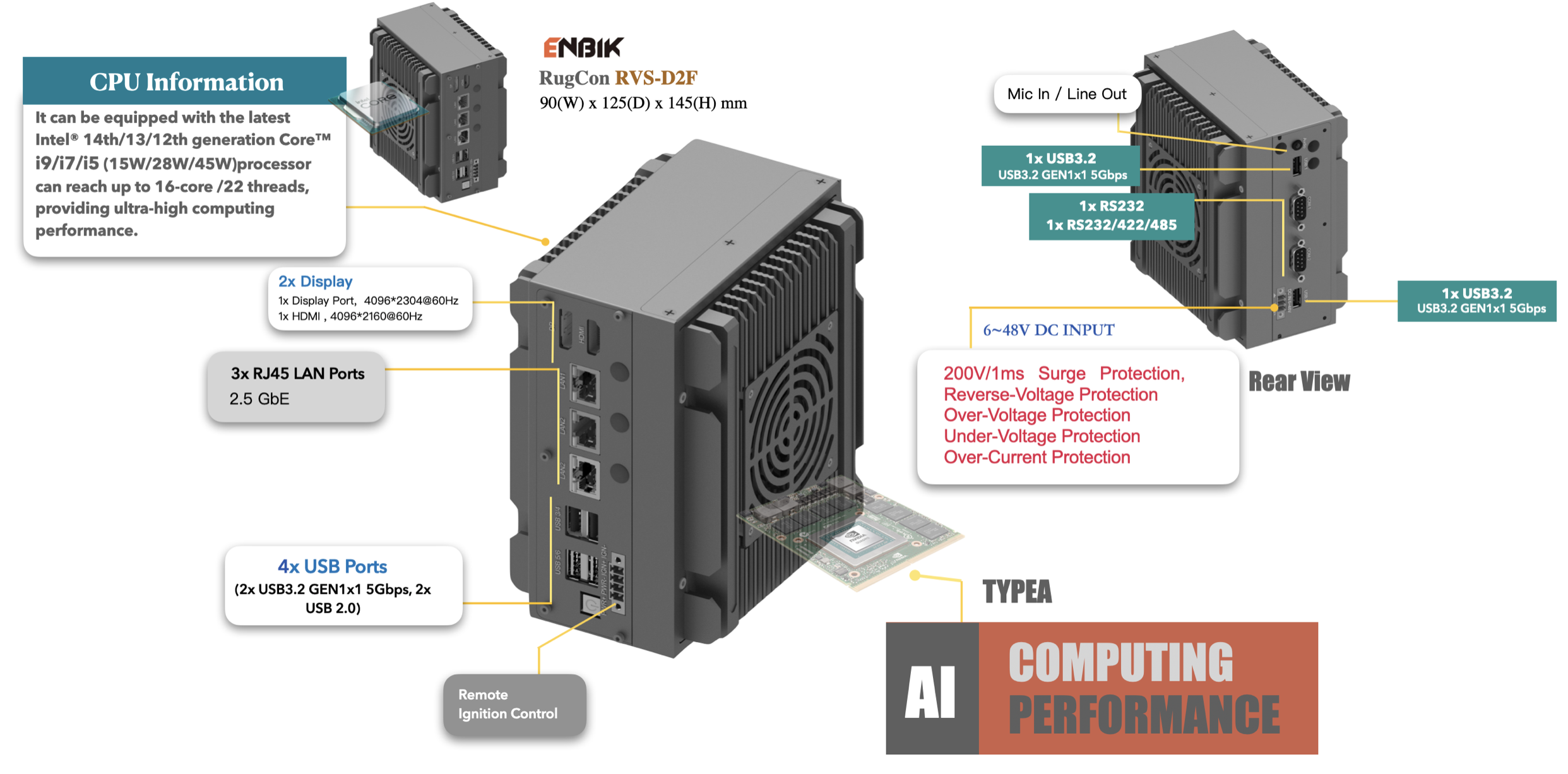 恩比克RugCon RVS-D2F是世界上最小并且配置3个2.5GbE的MXM GPU边缘AI人工智慧运算平台,具备手掌大小的尺寸仅为145 x 125 x 90毫米,非常适合部署在空间受限及宽温工作环境中并可靠有效运行,此外,由于RVS-D2F具有双边散热设计,它可以在边缘高温环境中轻松执行人工智慧任务。 另外RVS-D2F采用低功耗英特尔高效能处理器和GPU使其可以在电源供应能力有限的边缘环境中轻松部署,并展示出色的人工智能推理任务。 RVS-D2F并提供各种I/O埠,包括3个2.5GbE网口、1个RS232/422/485、1个RS232、8个USB和多个M.2内部扩充套件插槽,用于5G/4G/WIFI/GPS。 RVS-D2F还配置有2个M.2 2242 SATA III插槽,可以同时安装两个固态硬碟。